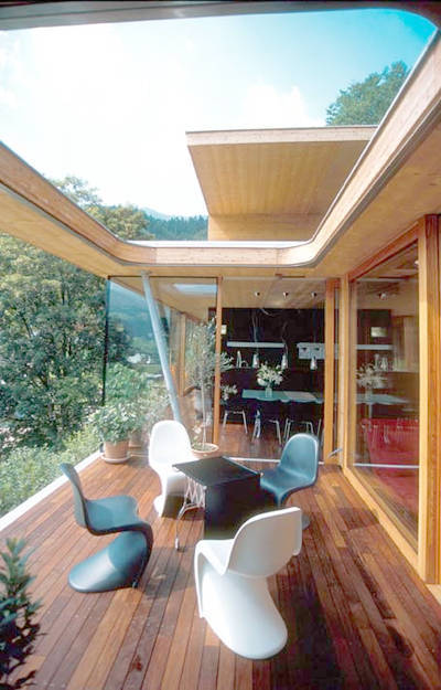 Um die Naturwiese möglichst unvermindert unter dem von den Architekten selbst bewohnten Haus durchfließen zu lassen, wurde nur ca. ein Drittel der Gebäudefläche mit einer Stahlbeton-Fundamentplatte im Erdreich verankert, der restliche Baukörper ruht auf sechs schlanken Stahlstützen, die mit Punktfundamenten im Boden fußen. Eine weit auskragende Südterrasse unterstützt die Leichtigkeit des Holzbauwerks am Hang. Von diesem „Logenplatz“ inmitten des Ennstaler Landschaftsraums lässt sich der Jahreszyklus der Natur genießen, auch auf die nach oben offene Terrasse zwischen Küche und Wohnzimmer dürfen ungehindert Schnee und Regen fallen.