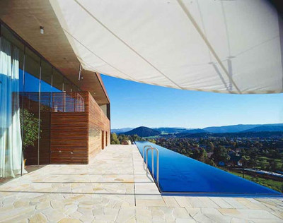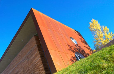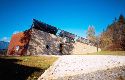 An der östlichen Längsfront dient eine Natursteinmauer als Wärmespeicher, die Westseite ist grosszügig geöffnet, die geschlossenen Schmalseiten sind – ein kleiner Verweis auf den nahen Industrie-Standort Leoben-Donawitz – mit Cortenstahl bekleidet. Alle Materialien sind, dem ökologischen Credo von Bauherrn und Architektin entsprechend, unbehandelt und „roh“ eingesetzt, sodass die Stahlfassade eine matte Rostschicht ziert. Ökologische Grundhaltung und anspruchsvolle Architektur in respektabler Synthese... (Text: Gabriele Kaiser, 1.08.2003)