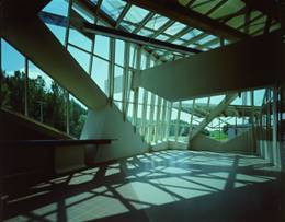 Verbunden sind diese beiden Teile durch eine Medienbrücke (46 m Länge / 2,50 m Breite). Die Halle hat vier kleine Vordächer und ein grosses Flugdach. Das Energiezentrum hat weiters eine Kaskade (13 m hoch) und die drei oben genannten Kamine, die den Namen „tanzende Kamine” tragen. Ein weiterer räumlicher Eingriff ist die „explodierende Ecke”, in der der Präsentations- und Empfangsraum untergebracht ist.