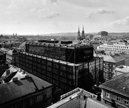 Um die Deckenstärke der Hörsäle zu minimieren, musste das Gewicht der sieben Obergeschosse über andere Wege ins Fundament gelangen. Eine Lastabtragung über dem Erdgeschoss hätte hier eine enorme Konstruktionshöhe bedingt. Wegen der beschränkten Bauhöhe wäre damit ein ganzes Geschoß an Nutzfläche entfallen. All diese Faktoren begünstigten die Idee, das ganze Haus von einem zurückgesetzten Dachgeschoß aus abzuhängen.
