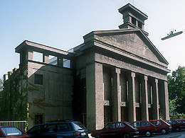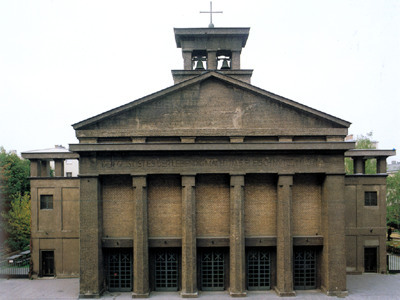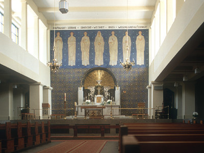 Eisenbetonkonstruktion Kirchenraum: Die seitliche Arkadierung wird durch zwei parallel liegende, über 20 m frei gespannte Träger ersetzt. Die einzelnen Pfeiler wurden bei den Widerlagern in Vierergruppen aufgelöst. Das ergab eine Neudefinition des historischen Raumtyps - der Trennung in Mittel- und Seitenschiff - es entstand eine Art quadratischer „Breitraum”, der die Kirchenbesucher dem Altar näher brachte und gleichzeitig verbesserte Sicht und Akustik zur Folge hatte.