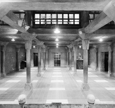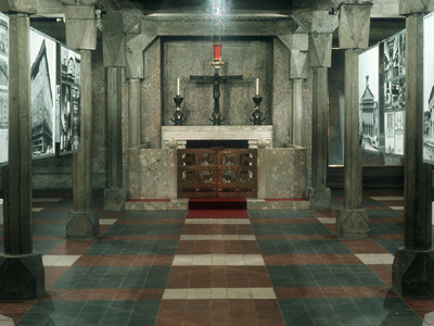 Konstruktion Krypta: Die äußerst dünnen Säulen sind in ein von der Wand unabhängiges Gerüst eingebunden, die Kapitelle entwickelten ihre Form aufgrund der Eisenbetonkonstruktion. Die tragende Struktur hat eine feine Körnung, die Wände sind durch den beigefügten Ziegelsplitt porös und rötlich.