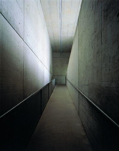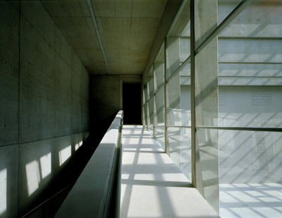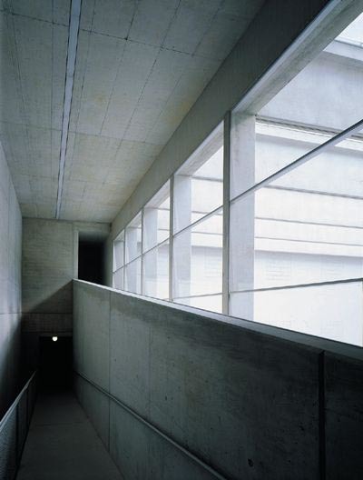 Natürlich dient der Hof auch als Ausstellungsraum; die siebbedruckten Gläser filtern bereits 60 Prozent des Sonnenlichts, um UV-Schäden an Kunstwerken zu vermeiden. Die Rampenanlage bildet ein wichtiges Element: Sie ist explizit „Weg“. Zugleich findet schleifend die Niveauveränderung statt, wobei der Blick zum Hof durch den Stützenrechen von allen drei Läufen aus möglich ist. Man ist getrennt und hat dennoch Anteil am großen Binnenraum. Auch hier wieder Beton mit fast samtiger Oberfläche. Ein feiner Handlauf, metallener Rundstab an gekantetem Blech, die Farbe fast Ton in Ton mit dem Beton.