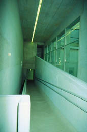 Der Innenhof ist an zwei Seiten, vor Servicegang und Box, von Sichtbetonwänden begrenzt. Zur Rampenanlage filtern Betonstützen und schräg eingesetzte Glastafeln den Raum. Schlanke Betonträger überspannen parallel zum Straßentrakt den Hof, sie sind nur im Neubaubereich auf der Mauer vor dem Dienstgang und auf den Stützen vor den Rampen aufgelagert, der Altbau bleibt unbelastet.