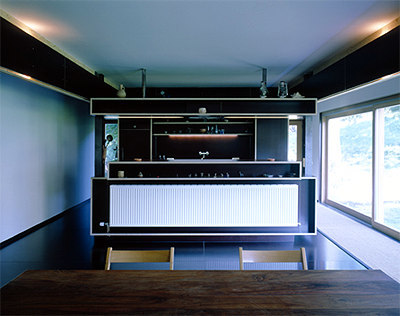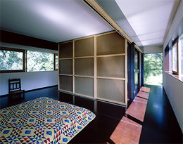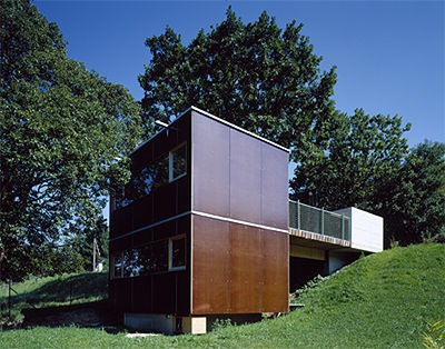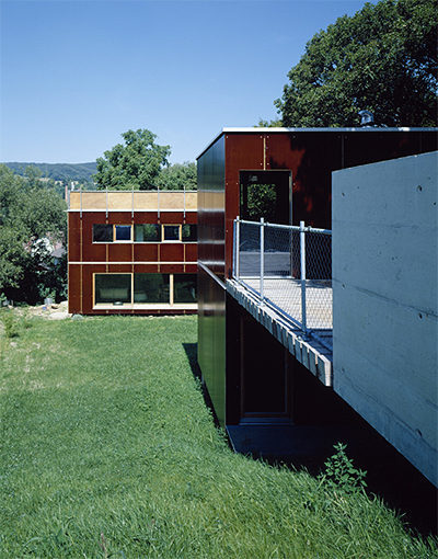 Die Gebäude selbst gliedern sich ähnlich: Zwischen und rund um ein innenliegendes Tragsystem, das zugleich der Versorgung mit Energie (Strom, Gas, Wasser) und Information (Telefon, Internet, Fernsehen...) dient, sind die Lebensbereiche angeordnet. Sanitärterminals (WC, Bad, Küche,...) und Treppenmodule ergänzen und gliedern den Innenraum. Hochwärmegedämmte, mehrschichtige Holzfertigteile und eine Kombination aus fixen und öffenbaren Verglasungen bilden die Klimahülle. Die Dachterrasse des Wohnhauses ist über eine Dachausstieg begehbar und bereichert so den zentralen Aussenbereich um ein zusätzliches Niveau. Das hochvorgefertigte Schnellbausystem ermöglichte eine Bauzeit von nur vier Wochen für die Holzkonstruktion, Anpassungen an veränderte Lebens- und Arbeitszusammenhänge sind jederzeit möglich. (Gabriele Kaiser nach einem Text der Architekten)