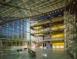 Man betrat die Schule seitlich über einen Steg in einer großen, hellen Aula aus Stahl und Glas, 15 Meter hoch, darüber ein schräges, blau getöntes Glasdach, das auch Fassade war, auf einem Tragwerk aus Stahl. Dahinter ein zweites Schrägdach, 1500 m² Glas über einem tief ins Erdreich eingegrabenen Dreifach-Turnsaal. Dazwischen ein Pausenhof, oft wurden die Dächer als Libellenflügel rezipiert, Peter Cook sprach von „hand-tailored tech“.