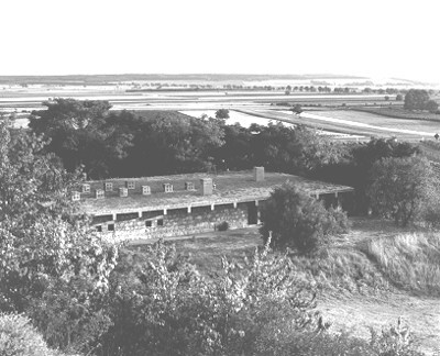 Für den fast klösterlichen Bau, der nur aus einem Gemeinschaftsraum mit Küche und acht Schlafzellen besteht, wurde das vorhandene Sandsteinmauerwerk (mit darunterliegendem Keller) entsprechend korrigiert und ergänzt. Darüber wurde aus Beton-Fertigteilen (U-Träger) ein weit auskragendes Dach gelegt.