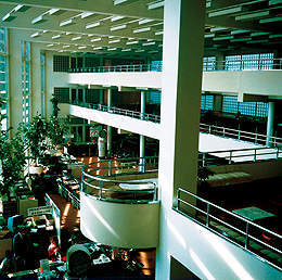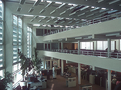 Mit der offenen Schalterhalle hinter einer Matall-Glas-Fassade und beschattenden, horizontalen Lamellen wird darauf Bezug genommen und die Erinnerung an die Lücke bewahrt. Das neuerrichtete Innenleben, eine Galerie mit Arbeitsplätzen über den Bankschaltern greift in den Altbestand hinein, dessen Struktur nicht zerstört wird. Der Eingang verbleibt im zeichenhaften Eckturm.