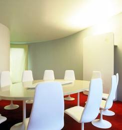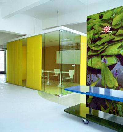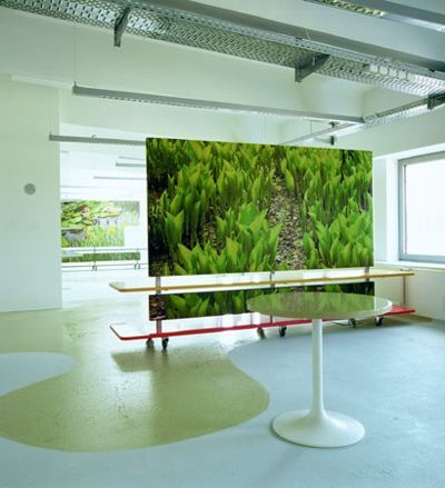 Auch die Formen der fixen und mobilen Einrichtungsgegenstäne stehen in starkem Kontrast zueinander. Weiche Rundungen von Möbeln im Stil der 1960er Jahre und locker fallende Textilien sind mit strengen Glasboxen und –schiebewänden kombiniert. Die wie umgekehrte Pilzstützen aussehenden, einfüßigen Tische und Sesseln in glänzendem Weiß vor beispielsweise rotem Hintergrund stellen ein perfektes Spiel von Figur und Grund zur Schau. Fototapeten mit großen floralen Motiven ergänzen die gekonnt inszenierte Kulisse für den kreativen Büroalltag. (Text: Marion Kuzmany)