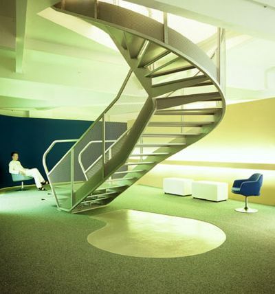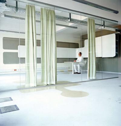 Die zur Innenraumgestaltung verwendeten Farbkombinationen bestehen immer aus weiß und einer Kontrastfarbe aus der Palette der „Corporate Identity“. Alle Farben sind gezielt eingesetzt, um Stimmungen von animierend bis beruhigend zu provozieren.