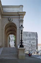 Der erste Kardinalfehler passierte 1990 der Jury unter dem Vorsitz Ernst Gisels. Ortner & Ortner reichten für die zweite Runde ein völlig anderes Projekt ein. Eines, von dem Hans Hollein behauptete, es sei von seinem Entwurf abgekupfert. Wie auch immer: Ortner & Ortner übernahmen Holleins Strategie einer städtebaulichen Collage. Die weitgehend unverbindliche Verteilung und Ausformung der Bauten im Entwurf ermöglichte Rochaden, Verkleinerungen, Auslassungen und den Austausch von Bautypen (Stahlbetonbau statt Glas-Eisen-Bau). Durch die Veränderungen und Abweichungen vom tatsächlich prämierten Entwurf lassen sich viele unverständliche Aspekte der nun vollendeten Neugestaltung erklären. Zum Beispiel, weshalb der Weg so obskur über die Dachböden geführt wird: weil die Altbauten nicht durch Neubauten ersetzt wurden. Oder weshalb das MUMOK von der rechteckigen Ausrichtung der barocken Anlage abweicht: weil die Achse des MUMOK auf einen der letztendlich doch nicht gebauten Neubauten ausgerichtet war und als Residuum der ursprünglichen, durchaus sinnvollen Komposition übernommen wurde - nun völlig sinnlos und falsch. Eine Abweichung übrigens, die den Eindruck hervorruft, dass die Winterreithalle die beiden Museumsblöcke fast gewaltsam auseinander hält. Ganz im Sinn der katholischen Ikonographie übrigens, die Ortner & Ortner der gesamten Komposition - bewusst oder unbewusst - zugrunde gelegt haben: Das Helle ist das Gute, das Dunkle ist das Böse, und das Böse wird zurückgehalten.