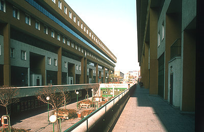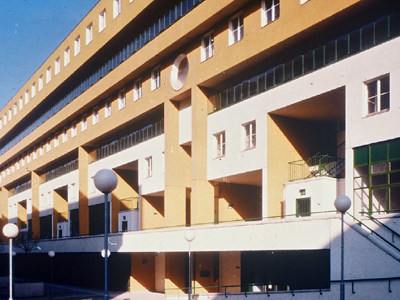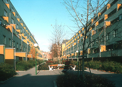 He designed a central, north-south oriented main axis that cuts through the area as a pedestrian street. Public and private activity are constantly interwoven in this street, which functions as shopping street, playground and market square. Since the apartment complex comprises several Gründerzeit blocks, the pedestrian street also serves as a connector between the existing arterials, and provides access to the green areas within the development. Access to the apartments is either directly via the pedestrian street or via arcades, in order to extend the communal street space even further.
