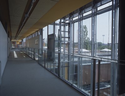 Dieser klaren Ordnung sind im mittleren Maßstabsbereich zahlreiche, bewusst gesetzte Schwenkungen, Schrägen, Versätze, Ausbuchtungen und Verengungen überlagert. Sie durchziehen die nüchterne, in Stahlbetonelementbau errichtetete Primärstruktur mit einem differenzierten räumlichen Gefüge, in dem das Leben sich entwickeln kann, wo auch die Poesie ihre Orte findet. Die Farbgebung (Beratung Oskar Putz) läßt beim Begehen da und dort einen Akzent von außen nach innen wirken.