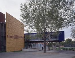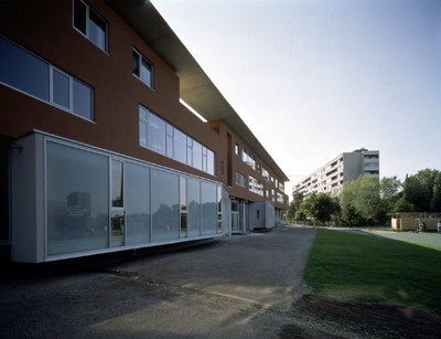 Nahe der Wiener Südostumfahrung, in einem in den sechziger Jahren mit Scheibenhäusern bebauten Geländezwickel, blieb ein großer, von hohen Bäumen gesäumter Freiraum erhalten. Den südlichen Rand schließt der Längstrakt des Schulbaus, davor liegen Pausenfläche und Sportfeld, eingefasst vom weiten Schwung eines Teiches.Die Schule ist kammartig organisiert. Von einem langen, ostwest verlaufenden Primärtrakt, der die Erschließung und gemeinschaftliche Funktionen enthält, streben kürzere Sekundärtrakte mit den Klassenzimmern nach Süden weg. Den Kopf bildet das große Volumen zweier übereinander gestapelter Turnhallen. Den Eingang markiert der darüber aufgestelzte Flügel des durch den Längskörper stoßenden Sonderklassentrakts.