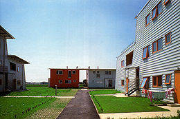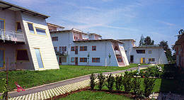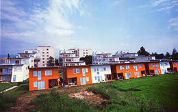 Die Anlage bestimmende Farben der Hausfassaden: Orange, weiß-gelb, grün.