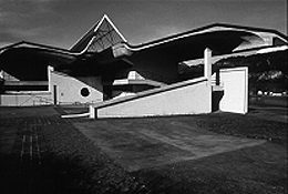 Die weiße Mauer, deren Flächigkeit durch runde Öffnungen betont wird, ist abgeschlossen vom Fensterband als Schattenzone des Daches. Zwei elegant geschwungene Betonschalen werden von einem spitzwinkeligen, durchgehenden Glasoberlicht getrennt. Darunter befindet sich die innere Straße, das Rückgrat, von dem praktisch sämtliche Räume erschlossen werden.