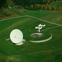 Die raffinierte Ästhetik der Anlage besteht in der Konfrontation bzw. der Durchdringung von technisch-geometrischen und natürlichen Formen. Der Durchmesser des Antennenspiegels (32 Meter) wiederholt sich horizontal als Hof des Betriebsgebäudes, aber auch als Hof für die Antenne und schließlich im Kreisrund des Parkplatzes. Dem an sich schon eindrucksvollen Gebilde der Antenne antwortet eine halb versunkene Architektur, die durch ihre betonte, elementare Geometrie die Form des Geländes eigentlich erst sichtbar macht.