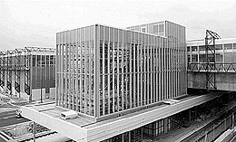 Derzeit wird in den sechs neuen Stationen nach wie vor auf Hochtouren gearbeitet, und wenn man die Baustellen inspiziert, dann weiß man, daß bis zur Eröffnung am 4. Mai bestimmt nicht alles fertig sein wird. Aber immerhin, die Züge der U-Bahn fahren schon, wenn auch einstweilen nur im Probebetrieb. Eine Station, die fast in Sichtweite des Handelskais - nur die Donauinsel schiebt sich dazwischen - und ebenfalls in Hochlage errichtet wurde, liegt an der „Neuen Donau“. Sie steht auf der Eindeckung der Donauufer-Autobahn und enthält eine kleine, bescheidene EXPO-Reminiszenz in Form eines Parkplatzes: Hier hätte der EXPO-Shuttle seinen „Bahnhof“ haben sollen. Die Lage dieses Stationsgebäudes ist recht spektakulär: Man hat einen wundervollen Ausblick auf das Kleingartengebiet, auf die „Neue Donau“ und hinüber zur Donauinsel. Die Station „Neue Donau“ demonstriert alle Merkmale des aktuellen U-Bahn-Konzepts in Reinkultur: Die Primärkonstruktion ist ein Stahlbauskelett aus mächtigen Raumfachwerksträgern, die sowohl im Bereich der 115 Meter langen Seitenbahnsteige außen liegen (da sind sie am Bahnsteigtragwerk befestigt) als auch im Bereich des Aufnahmegebäudes (da stehen sie vor der Fassade). Im übrigen gibt es viel Glas.