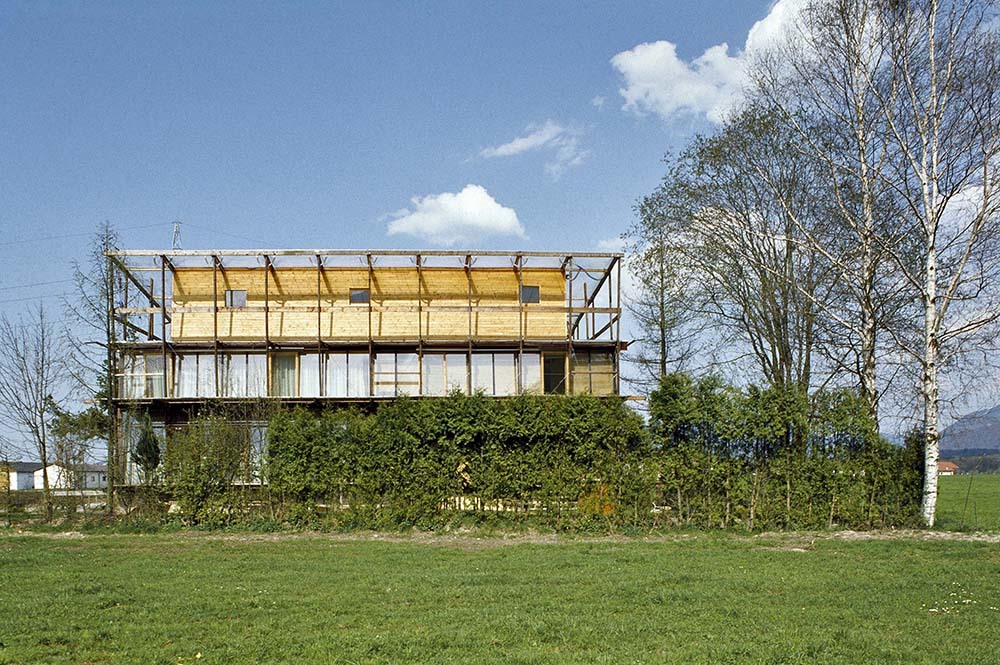 Die Rahmenbinder werden durch die V-förmige Aufteilung der Stützen ausgesteift; mit dem Balken des obersten Fußbodens und einer außen ansetzenden Strebe wird das System stabil. In der anderen Richtung steifen die Außenwände aus. Die Konstruktion leitet sich her vom Zimmermannswerk landwirtschaftlicher Nutzbauten. Das intelligent konzipierte Gerippe einer zeitgenössischen Scheune wird im Entwurf umgedacht zu einem Wohnhaus. Die leichte Schrägstellung der Längswände entspringt einem mehrdeutigen Spiel.