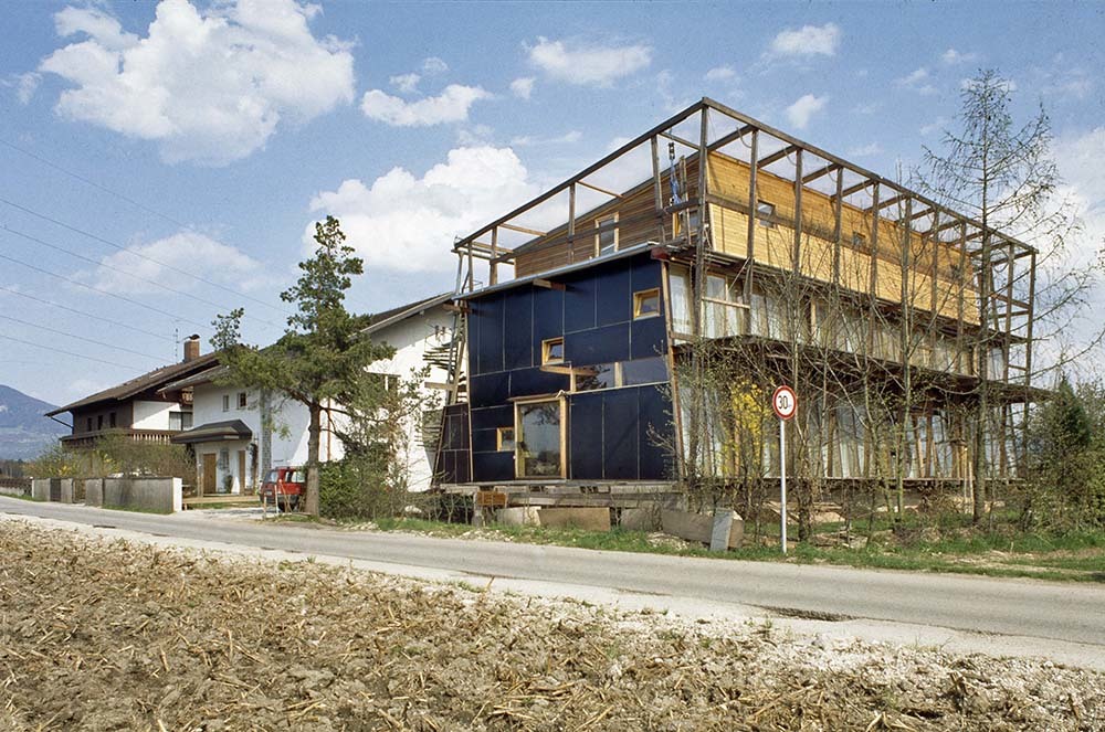 Zum einen interpretiert sie die statische Primärstruktur, aber zugleich auch die Südexposition und bildet einen Dachüberstand an der Nordseite. Das Verkippen der Großform mag auch ein Hinweis auf Vergänglichkeit sein, jener von Holzbauten, die im „Moos“ langsam einsinken, oder jener beim Zerfall von Pflanzen zu Torf, aber auch auf Vergänglichkeit schlechthin - als eine kritische Stellungsnahme zum Zeitgeschehen. Zu diesen konstruktiv-architektonischen Überlegungen fügen sich innovative wärmetechnisch-ökologische Maßnahmen auf einfache und einleuchtende Weise.