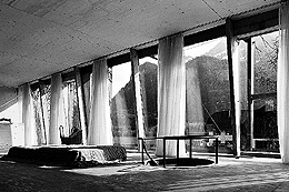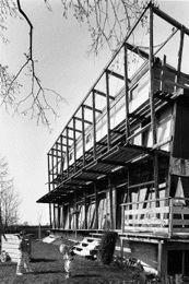 Die einfache Struktur des Entwurfs zeigt sich im Schnitt. Elf hölzerne Rahmen definieren einen, in drei Geschoße unterteilten Großraum. Davon sind mehrere Nebenräume abgetrennt. Im Grunde handelt es sich um eine Art „Loft“, die spätere Unterteilungen zuläßt. Interessant ist die formale und funktionale Durchdringung von Tragwerk, Konstruktion und äußerer wie innerer Form.