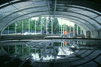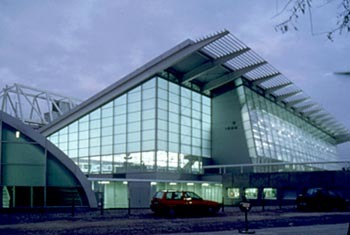 Die gläserne Hülle der Halle spielt jedenfalls alle Stück'ln. Und sie zeigt, was den Architekten ein Hauptthema war: das Licht und die Ausblicks- und Durchblicksmöglichkeiten. Das mag bei einer großen Publikumsveranstaltung nicht besonders wichtig sein. Aber die Sportler, die hier trainieren, werden Luftigkeit und Transparenz des Baus zu schätzen wissen. Licht in einer Eishalle ist gar nicht so selbstverständlich. Denn Sonneneinstrahlung auf der Eisfläche wäre natürlich kontraproduktiv. Dieses Problem kann man heute durch eine entsprechende Verglasung ohne weiteres lösen. Bei der Eishalle ist daher nur ein Teil der Scheiben durchsichtig, der andere Teil, vor allem im oberen Bereich, ist mit Litex beschichtet, sodaß wohl Licht hereinfällt, aber die Sonnenstrahlen abgeschirmt werden.