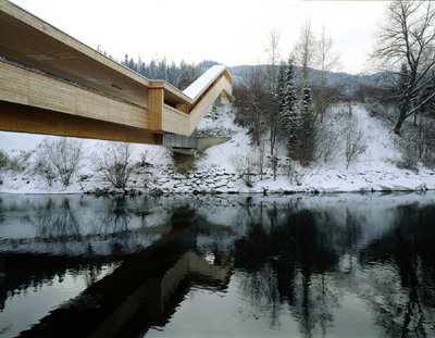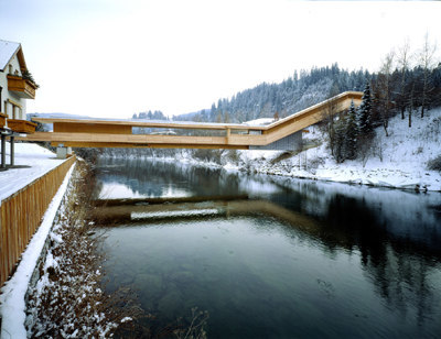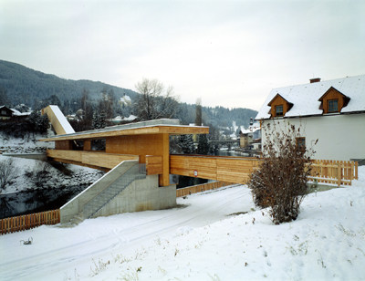 Architektonisch bezieht sich der betont räumliche und abwechslungsreiche Weg über den Fluß auf die beiden verschieden hohen Ufer, von denen je zwei Zugänge auf die Brücke führen, die sich im großen „Fensterraum“ über dem Fluß treffen, wo die Aussicht auf Satdt und Schloß Murau am eindrücklichsten ist.