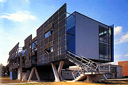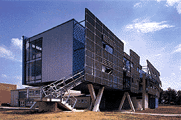 Die raumbildende Hülle des Riegel ist schalenartig von einer Innenschale über die Wärme- und Schallschutzschale bis zur Außenhaut in Trapezblech in Lagen aufgebaut. Verzinkte Gitterrostelemente sind zum Teil beweglich. Sie umfangen mit Distanz den Baukörper als innen- und außenraumwirksame Haut. Je nach Größe und Stellung der Lamellen dienen sie entweder als Schatten- oder als Lichtspender.