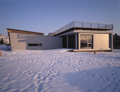 Das Konzept dieses Bauwerks besticht durch seine unauffällige, aber irgendwie zwangsläufige Präzision. Die „dienenden“ Bereiche des Hauses sind zur Straße, zur Wohnbebauung, nach Süden orientiert. Dieser Teil ist in Massivbauweise - in Beton - ausgeführt. Die Gruppenräume mit der schönen Leimbinderkonstruktion, die eben diese Durchgängigkeit von innen nach außen möglich macht, schauen nach Norden.