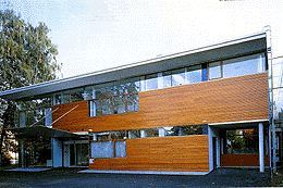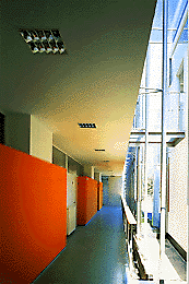 Die Verbindung erfolgt über Brücken unterschiedlicher Länge, da die beiden Baukörper nicht exakt im rechten Winkel stehen, sondern der Westblock um zwei Grad verschoben ist. Im Erdgeschoss im Südblock, wo sich auch der Geimenschaftsbereich befindet, hat man direkten Zugang zu Terrasse und Garten. Hinter einer roten Schiebewand befindet sich die Kapelle.