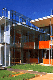 Das ganze Haus ist lichtdurchflutet, die Erschließungswege sind teilweise von oben tagesbelichtet. Der Westtrakt beinhaltet den Großteil der 19 Einzelzimmer, die von einem vollständig verglasten Erschließungsgang an der Ostseite erreichbar sind. Jedes Zimmer hat einen großzügigen Balkon, der durch ein überhängendes Dach geschützt ist.