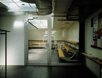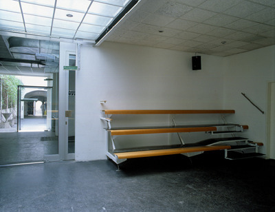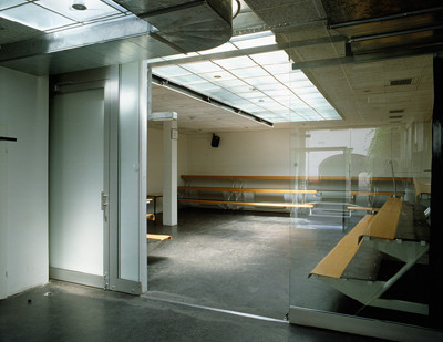 Im Hauptraum laufen entlang der Wände minimal dimensionierte Sitzstufen, die aber den Blick zur Wand zulassen und dadurch den Raum größer wirken lassen. In der Schiebewand zwischen Vor- und Hauptraum wurde auch eine Tür angebracht: Es ist der vorgeschriebene Notausgang.
