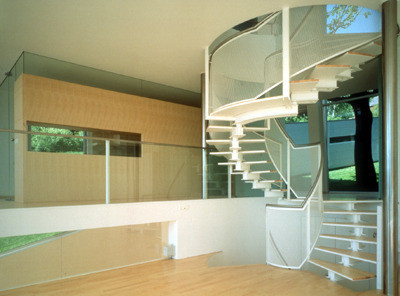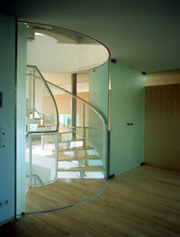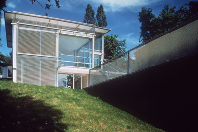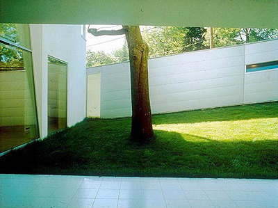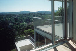 Vier schlanke Stahlbetonsäulen, die die Hauptlast der Dachplatte tragen, große Glasflächen bzw. Glasschiebewände, ein gewisses Drehmoment in der Wegführung durchs Haus, die reduzierte Materialität sowie eine souveräne Detailarmut sorgen für ein zur Natur offenes Wohngefüge, das trotz des sichtlichen formalen Kontrasts zu den Resten des Altbestands strukturell aus diesen erwächst. (Text: Gabriele Kaiser)