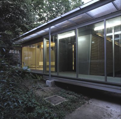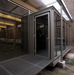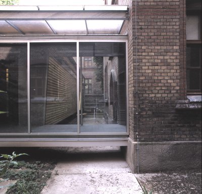 Grauer Boden, an der Betonwand silbergaue Platten, sonst gelb lasiertes Sperrholz und Schiebeflächen definieren den Innenraum. Die nördliche Stirnwand ist ganz in Glas aufgelöst und voll zum grünen Hof zu öffnen. Komplexe, subtile Lösung der scheinbar einfachen Aufgabe, in dem schattigen Hof das neue Volumen minimal zu halten und dessen Innenraum dennoch so licht und großzügig wie möglich zu machen. (Text: Otto Kapfinger, 21.09.2000)