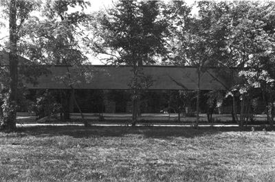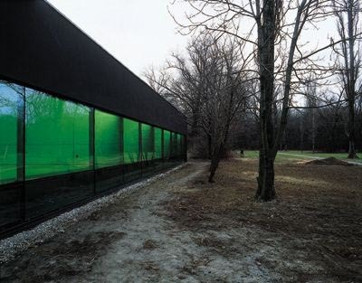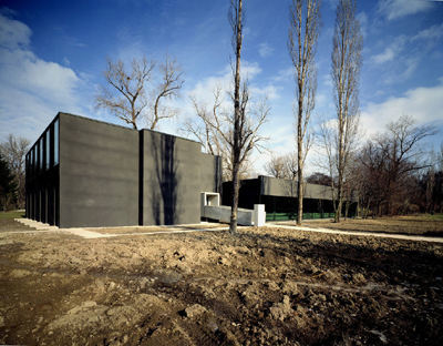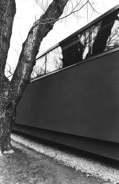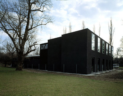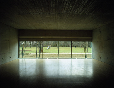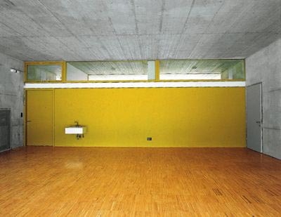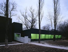 Der Bauteil, der wieder im Boden fest verankert ist, ist in den Naturtönen sowie in Grau für Zwischenwände und Einbauten gehalten. Die Kindergartenräume liegen 90 cm über Wiesenniveau, die Fenster haben keine Brüstung, reichen bis zum Boden und sind aus getöntem Glas.