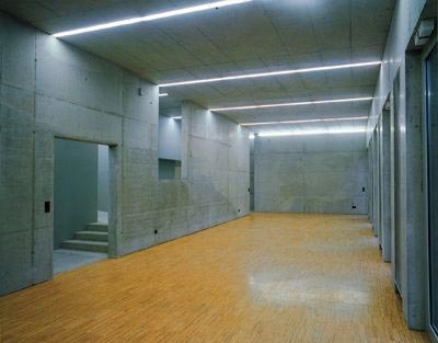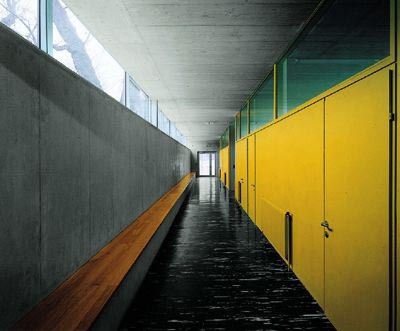 Die Betonstruktur wurde außen mit Dämmputz überzogen, im Inneren blieb der Sichtbeton unverputzt. Die Böden wurden mit Gummi bzw. Eichen-Industrieparkett belegt. Helmut Federle war verantwortlich für die Farbgebung: Ergänzend zu den Naturtönen von Eiche und Beton wählte er dunkelgrau/schwarz und gelb/grün, um sich den Farben der Natur anzupassen. Im Inneren wurden die Einbauwände des Kindergartens in der Querrichtung grau gestrichen, in der Längsrichtung grün / gelb.