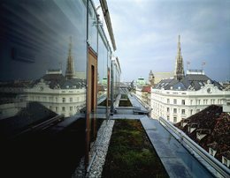 Die zwischen Nirosta-Stehern geklemmten Glastafeln mit strukturierend eingesetzten Holz-Fenster-Türen erlauben den direkten schwellenlosen Übergang von Holzboden im Inneren zu den außengelegenen Gründächern und den freien Blick zum Stephansdom im Osten, zum Wienerwald im Westen.