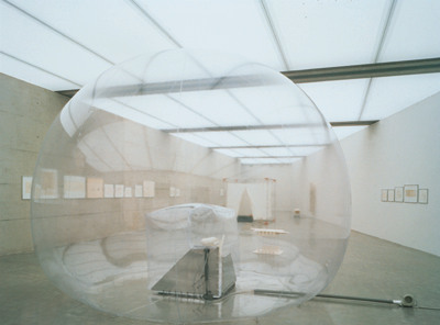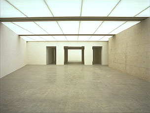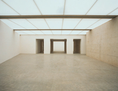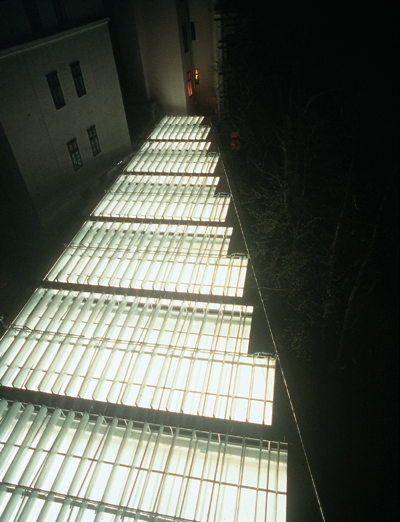 Wenn man innen im Ausstellungsraum steht, sieht man von den Deckeninstallationen nichts. Nicht das Kunstlicht, das es hier selbstverständlich gibt, auch sonst keine technischen Einbauten. Was man sieht, ist eine in großen Feldern (5 mal 2 Meter) gespannte, weiße Kunststoffmembran. Das ist schon ein phantastisches Material: Es stammt von einer Firma, die zum Beispiel mit Frei Otto beim Olympia-Stadion in München zusammengearbeitet hat oder mit Renzo Piano beim Fußballstadion in Bari. Die Bahnen dieses Materials werden stoßgeschweißt, sodaß die Nähte so fein sind wie bei einem Strumpf. Was damit erreicht wurde, ist – abgesehen davon, daß es den hierzulande ja besonders rigorosen Brandschutzbestimmungen entspricht – ein unheimlich gleichmäßiges, angenehmes, blendfreies Licht, das diesem Raum eine ganz eigentümliche Leuchtkraft verleiht.