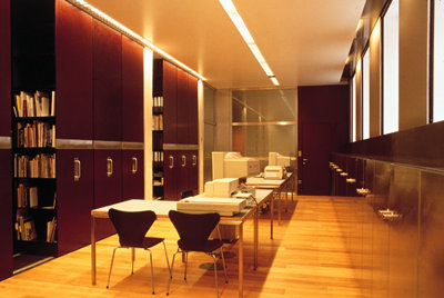 Der Studiensaal und die Verwaltungsräume sind im Obergeschoß des Gründerzeitbaus untergebracht, etwa auf der Höhe der Decke über dem Ausstellungssaal. Hier kommt man über eine neue, unbedingt sehenswerte Treppe hinauf. Und hier zeigt sich auch, mit welchem Geschick die Architekten mit dem gründerzeitlichen Grundriß zurechtgekommen sind. Da fahren zwei nackte schwarze Wände mit einem gewissen Tempo durch die historische Bausubstanz und bilden einen schmalen, sehr langen, von oben künstlich belichteten Korridor, der eine angenehm praktikable Mittelerschließung darstellt. Hier, im Studiensaal und in den Verwaltungsräumen, haben die Architekten auch Teile der Einrichtung entworfen. Aber designerische Geschwätzigkeit ist ihre Sache nicht, es geht vom Konzept her äußerst fein durchdacht zu, der formale Wortschatz bleibt wohltuend knapp.