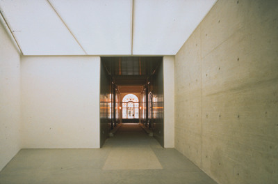 Soviel darf man zuversichtlich prophezeien: In diesen Räumen werden die Künstler und die Kunstwerke unserer Gegenwart schon bald auf ganz unproblematische Weise heimisch sein. Denn sie haben es in dieser Architektur zwar mit einem durchaus auratischen Raum zu tun, aber nicht mit einem eitlen. Die Architekten haben alle ihre Maßnahmen klar deklariert. Da weist einen schon im Zugangsbereich ein Materialwechsel von Putz und Stuck zu Nirosta und Beton darauf hin, daß es „neu“ weitergeht. Und weitergehen möchte man: Ein lichtdurchfluteter, durch eine 30 Meter lange, schräge Sichtbetonwand schmal zulaufender Ausstellungsraum lockt, in dem außer den scharfen Kanten der rohen Betonwand „fugenlose“ Flächigkeit herrscht. Man könnte auch Glätte sagen, wäre dieses Wort nicht negativ besetzt. Für den spiegelblanken Industriebelag auf dem Fußboden würde es sogar besonders gut passen.