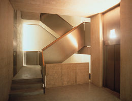 Jabornegg/Pálffy haben natürlich trotzdem einen riesigen Aufwand getrieben: Mit einer einfachen und kostengünstigen Lichtlösung einen Effekt zu erzielen, als befände man sich in einem High-Tech-Bau, das gelingt nicht von ungefähr; auch die Klimatechnik im Haus ist unheimlich raffiniert, weil es ja auch darauf ankam, selbst bei Veranstaltungen mit zwei- oder dreihundert Leuten ein gleichmäßiges Raumklima zu halten; das ist hier mit einem Bimetall-System gelungen, das auf die jeweilige Raumtemperatur reagiert und sich umstellt, sodaß seitlich von der Decke entweder gekühlte oder warme Luft in den Raum eingeblasen wird.