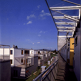 Christen relativierte den reinen architektonischen Raum, wie er zwischen den rhythmisierten Einzelgebäuden besteht, zu einer Art kollektivem Wahrnehmungsraum. Man müßte viel ausführlicher vom Entstehungsprozeß dieser Anlage reden: davon, daß mehr als ein Jahr über Wohnungsgrundrisse und Materialien diskutiert wurde; davon, daß eine eigene Errichtungsgesellschaft gegründet werden mußte, weil klar war, daß die Wohnbauträger, auf sich gestellt, das Projekt zu Fall bringen würden; davon schließlich, daß am Ende der pensionierte Landeshauptmann Siegfried Ludwig zum Repräsentanten des größten Wohnbauträgers mutierte und in dieser Eigenschaft die Realisierung forcierte, indem er ultimativ auf einem Entweder-Oder bestand.