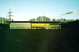 Im EG dahinter befinden sich die Lagerräume, Instandsetzung und eine große Werkstätte. Im OG ist der Produktionsbereich. Das große Dach ist den einzelnen Bauteilen übergeordnet, ruht auf Stahlstützen und stellt ein dennoch filigranes Tragwerk dar.