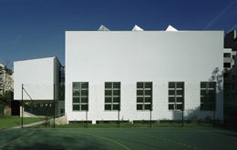 Im Anschluß an den Klassentrakt gelangt man in den Altbaubereich, wo ebenfalls unterrichtet wird. Der Turnsaaltrakt am anderen Ende des Schulareals ist quaderförmig angelegt, durch Sheds und Seitenverglasung belichtet und kann separat begangen werden.