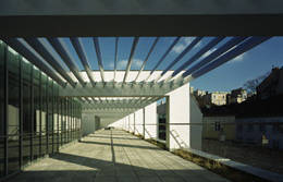 Parallel dazu läuft eine große Glaswand, wo sich dahinter der Gang zu den Klassenzimmern befindet. Den Abschluß des Vorplatzes gegen Westen zu bildet der querliegende Turnsaaltrakt, parallel zu ihm führt in Verlängerung der Pfarrhofgasse eine weitere öffentliche Wegverbindung zur Rochusgasse, wodurch die Schule aus drei Richtungen errreicht werden kann. Ein Arkadeneingang ist vor den ebenerdigen Festsaal gelagert.