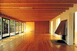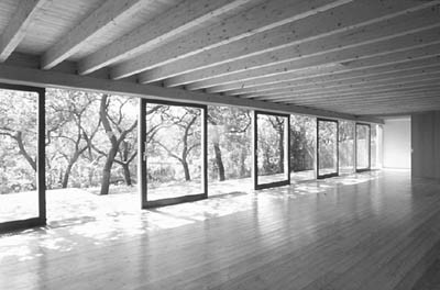 Das flache Dach ist mit Magerflora bewachsen; getragen wird es von einer dichten Schar schichtverleimter Holzbalken, die im Wohnraum sowohl Kontinuität als auch Rhythmus einbringen und beiläufig die Raumakustik verbessern. Von der verglasten Wand läßt sich jedes zweite Feld zur Seite schieben, sodaß zur visuellen auch eine räumliche Offenheit kommt.