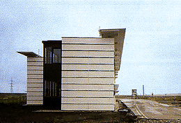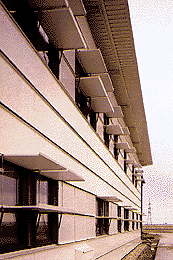 Die Fassade ist vorgehängt, aus beschichtetem Blech mit horizontal laufenden offenen Fugen für die Hinterlüftung. Vor den durchlaufenden Fensterbändern, in zwei Bahnen angeordnet, befinden sich jeweils zwei Klappen - übereinander angebracht und nach oben aufklappbar - wodurch man, durch Schließung dieser Klappen, die Fassade völlig fensterfrei gestalten kann.