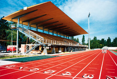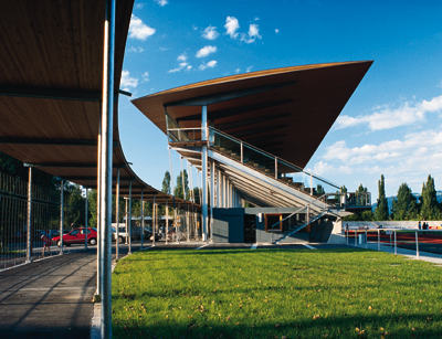 In zwei Tagen wurden damit 1000qm Tribünenfläche überdacht und mit Edelstahlblech gedeckt. Um das Dach gegen die am Bodensee auftretenden Windkräfte zu sichern, wurden im vorderen Bereich der Kragarme Kammern mit Kiesfüllung eingebaut, die ein Anheben der Dachfläche verhindern und die hintere Abspannung der Konstruktion von Druckkräften freihalten. 1.Preis eines 1992 durchgeführten Architektenwettbewerbes. (Text: Otto Kapfinger, 21.09.2000)