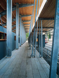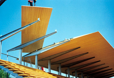 Das Tragwerk bilden Stahlstützen mit beidseitigen Kragarmen, ausgekreuzt durch Zugstangen; die Dachfläche, mehr als 8 m über die Stahlträger vorkragend, ist aus leicht gebogenen, zweischaligen Holzelementen in Spantenbauweise. Es sind sehr leichte, flügelartige Fertigteile, die in Längsrichtung durch eingeschobene Stahlträger auf den Kragarmen montiert und fixiert wurden.