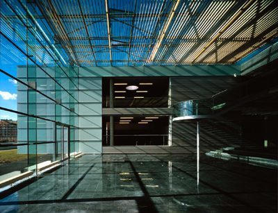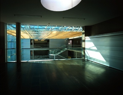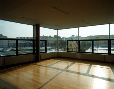 Schon mit der glasgedeckten Rampe zum Eingang im ersten Obergeschoß wird klargestellt, daß es sich um ein öffentliches Bauwerk handelt, um eine zentrale Anlage, die sich anbietet, für den Bezirk über die Schulnutzung hinaus Aufgaben zu übernehmen. Emporgehend gewinnt man nicht bloß einen Überblick über die teils noch offene Stadtlandschaft, sondern auch Einblick in die Innenräume.